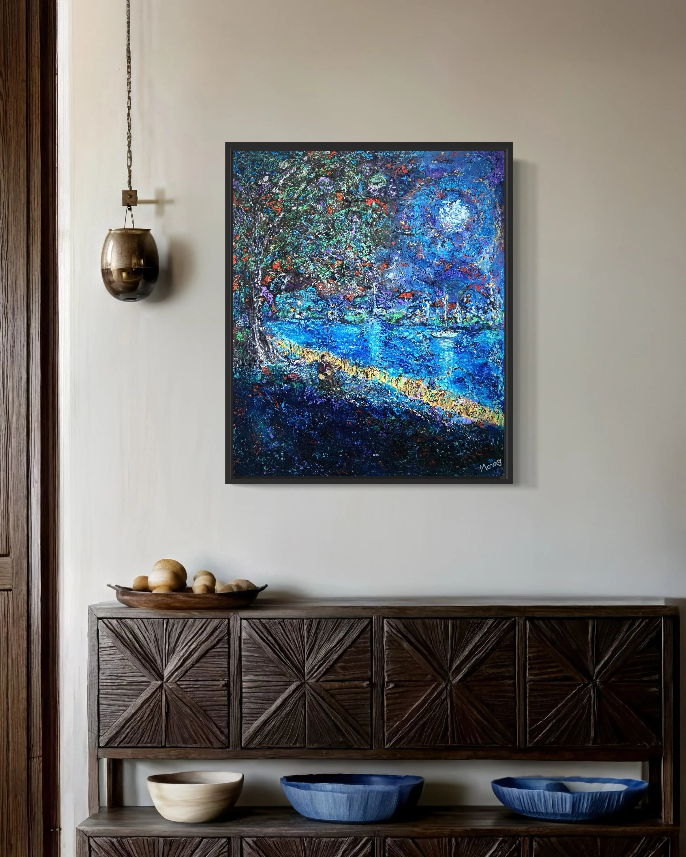 "Echoes of Twilight" is more than just a painting—it’s an experience. The deep impasto technique adds dimension and tactile richness, inviting viewers to explore the interplay of light and texture. Every stroke is intentional, creating a three-dimensional quality that draws you into the heart of the scene.